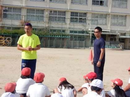 陸上競技の荒川大輔選手と宮川洋也選手に来校していただき、陸上競技、走り幅跳びの基本について教えていただきました。