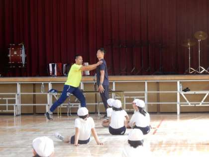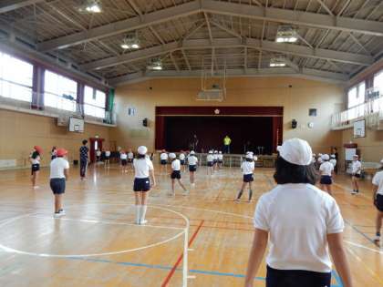 2時間目には、講堂で、荒川選手のお話のあと、準備体操の大切さを学びました。