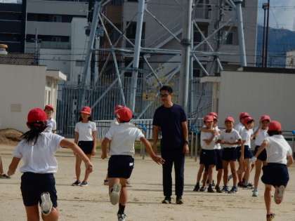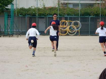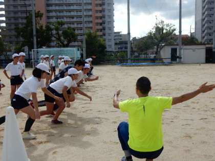 運動場の練習では、走り幅跳びに欠かすのことのできない走るスピードを上げる練習をしました。スタートの姿勢、足の着き方を丁寧に教えていただきました。