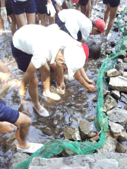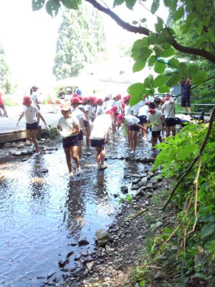 アスレチックが終了後、すぐ近くの小川で魚(ニジマス)つかみをしました。放流直後の魚は動きが鈍く、簡単に捕まえることができました。しかし、しばらくすると元気になりなかなか捕まえることができなくなりました。捕まえた魚は、すぐ塩焼きにし、おいしくいただきました。川の水は思いのほか冷たかったです。