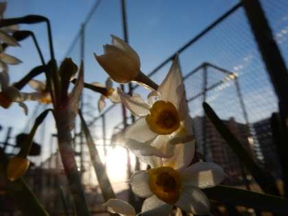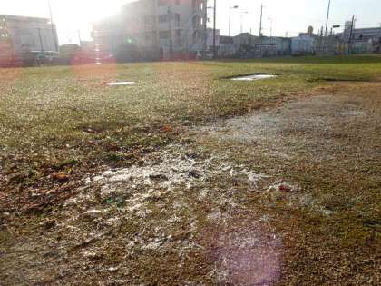 講堂東側の芝生広場では、早朝、氷が張っていました。