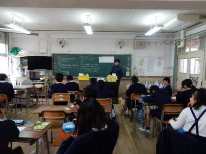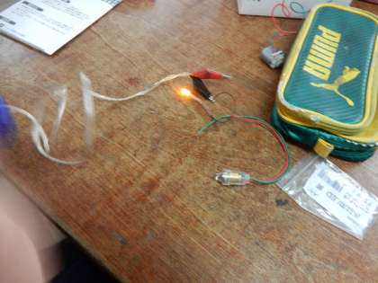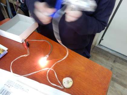 発電について学習しています。手回し発電機を使い、モーターを動かしたり、や豆電球に明かりとともしたりしています。