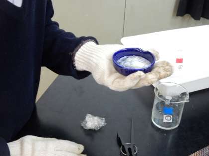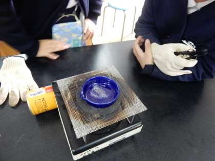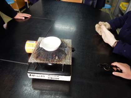 今日は、蒸発させる実験をしました。実験用コンロに金網を敷き、ミョウバンの水溶液を蒸発皿に乗せ、蒸発させていきます。次第に、白い粒が見えてきました。食塩の水溶液とミョウバンの水溶液では、同じ蒸発でも、様子が少し違うことに気づきました。