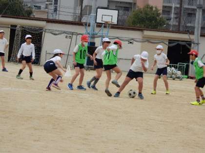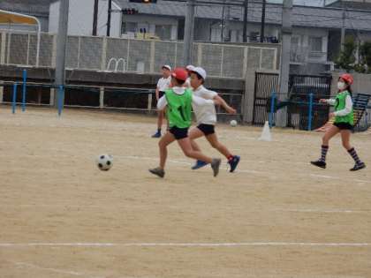 4年生にもなると、サッカーのゲームをしても迫力が出てきます。いろいろな個人技を持っている人もいます。ゲーム運びもうまくなります。楽しくゲームを行うことができました。