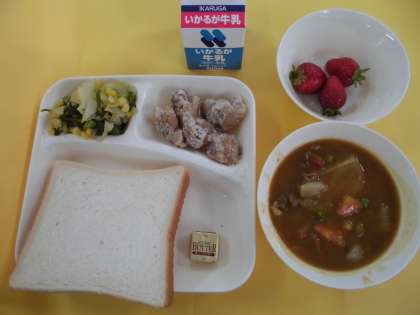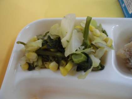 卒業祝い献立は、6年生の卒業をお祝いする気持ちが込められています。みんなに人気のあるフライドチキンやいちご、そして、春を感じる菜の花が入った春のカラフルソテーが登場しました。とてもおいしかったです。