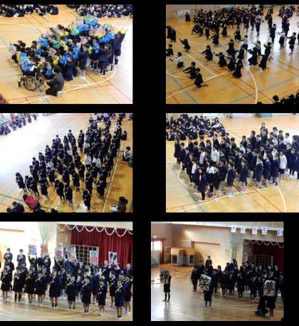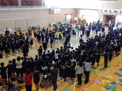 1年生から順番に、卒業を祝う出し物のあと、6年生の皆さんからの合唱、合奏、プレゼントがありました。