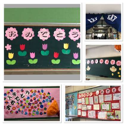 たくさんのおめでとうが並びました。玄関は、保育所や幼稚園の先生方から祝電をいただきました。楽しかった幼稚園や保育所での生活が思い出されることでしょう。教室もおめでとうがいっぱいです。明日の主役のピカピカの1年生を待つばかりです。