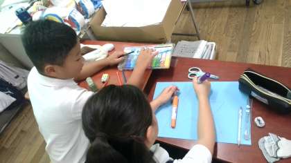 同じ係のメンバーと、どんなポスターにしようか相談しながらかいていました。