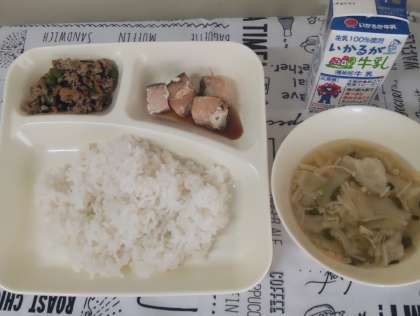 今日の給食では、焼き物機で焼いたさけに、甘辛いタレをかけておいしくいただきました!ごちそうさまでした。