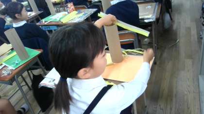 「コロコロガーレ」を作っています。ビー玉の通り道を考えながら、楽しんで取り組んでいました。
