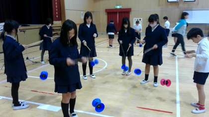 中国ごまのいろいろな技を見せていただいた後、実際にやってみましたが、なかなかむずかしいです。それでも、しばらくすると上手に回せる児童も出てきて、中にはこまを上に投げる技に挑戦している児童もいました。
