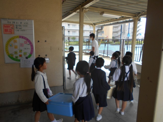 1年生は、昨日から給食の食器や食缶を自分たちで給食室に返しています。