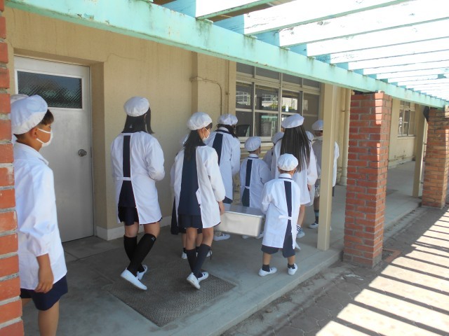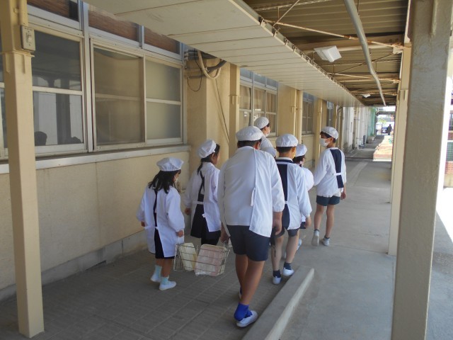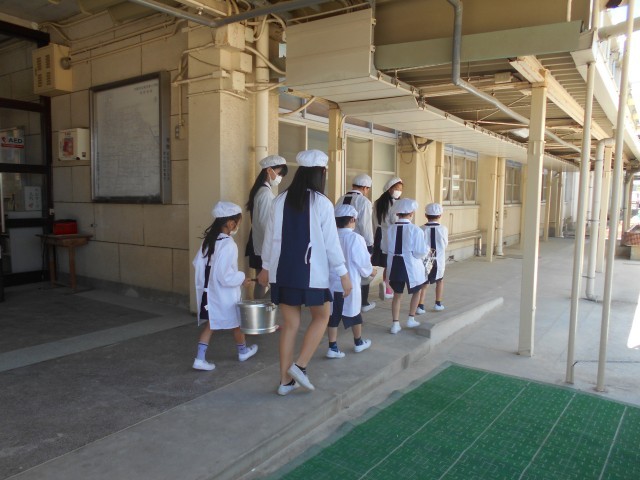 今までは、6年生が1年生の給食を運んでいましたが、今日から1年生も、6年生の力を借りながら給食を運んでいます。