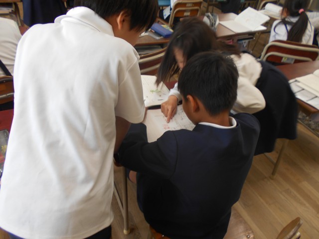 その中で、近くの友だちと自分が見つけた登場人物を出し合い、互いの考えを認め合っていました。