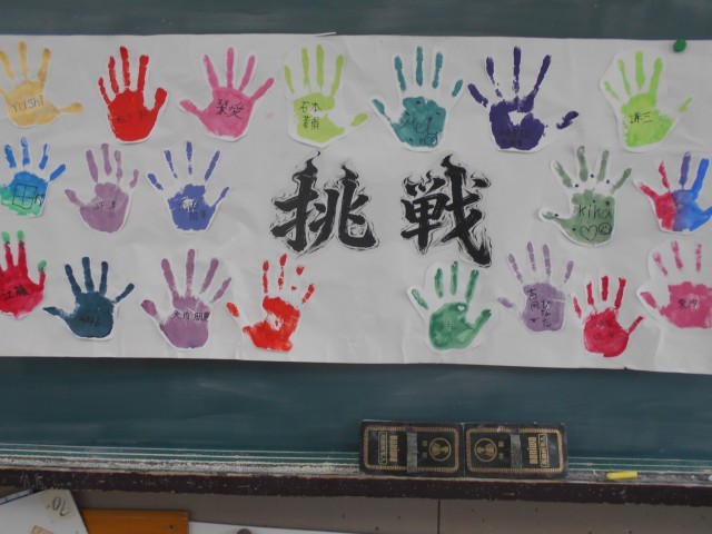 手がたで『挑戦』を囲んでいるのは、みんなで力を合わせて目標達成を目指すことを表しています。
