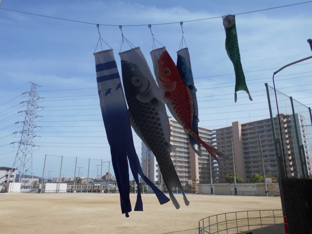 毎年この時期になると、長吉東小学校では、こいのぼりが風に吹かれて気持ちよさそうに泳いでいます。