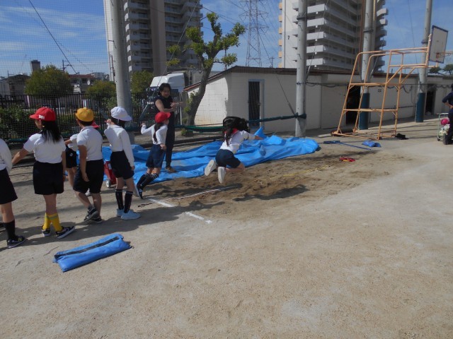 立ち幅跳びでは、全身を使ってばねのように跳んでいました。