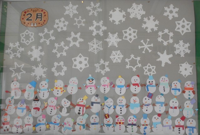 今月の玄関けいじは、2年生が制作しました。かわいい雪だるまがいっぱいです!