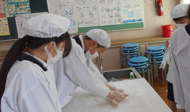うどんづくりをしました。生地を均一に伸ばしたり、同じ太さになるように切ったりする...