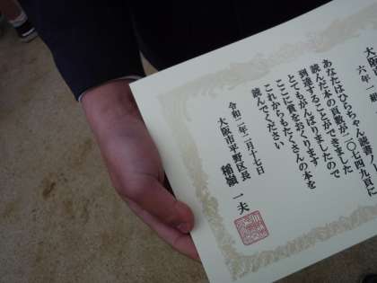 写真は、平野区役所と協力して取り組んでいる『ひらちゃん読書ノート表彰式』です。