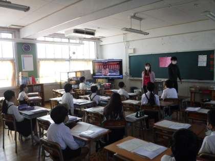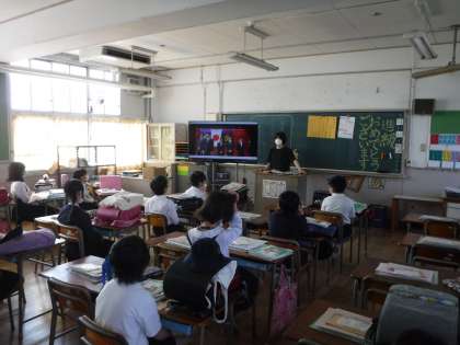 4年生は、新転任の教職員の紹介のビデオを見ています。新しく来られた教職員は、どんな方々か、早くお話したり一緒に活動したりしたいですね。