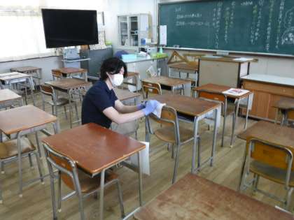 一人一人の机も、消毒を行っています。