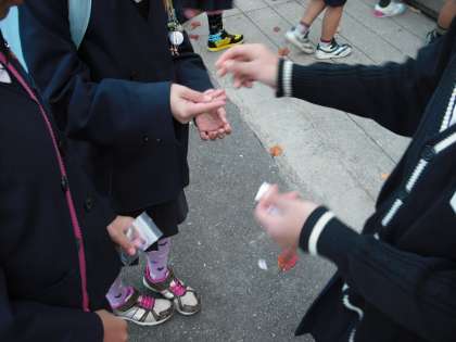 この日も朝から玄関に立ち、登校してくる子ども達に元気にあいさつの声をかけていました。あいさつを返してきてくれた人には、シールを慣れた手つきで渡していました。