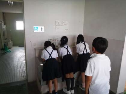 休み時間も、今日から運動場で遊ぶことができます。友達との距離を保つことができるときにはマスクを外してもよいです。休み時間の前後には手洗いをします。写真のように、しっかり手洗いをして教室に戻っていきました。