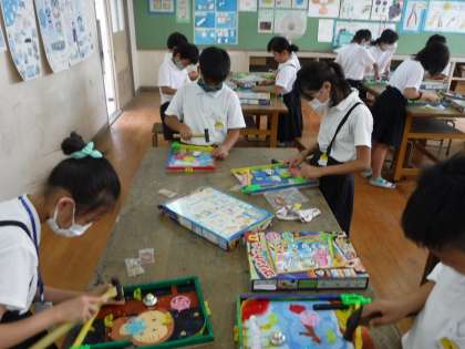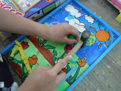 今日も、かなづちを打つ音が職員室に聞こえてきました。4年生は、3年生で学習したことを生かして、コリントゲームを作っていました。ビー玉が当たる場所にくぎを打ったり、はね返りを考えて鈴の位置を考えたりしていました。楽しく遊ぶことができるゲームができあがりますね!楽しみです!