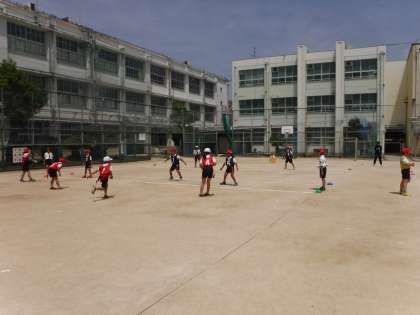 ボール運動「ボール運びおに」です。紅白玉を持ち、タグを2枚腰につけ、相手チームにタグを取られないようにコートを走り抜けます。タグを取られずに、紅白玉を入れることができれば、1点!