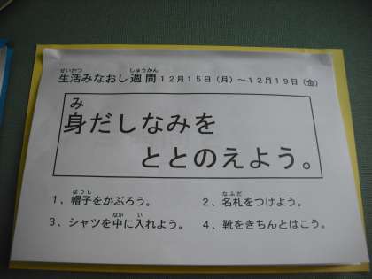 「身だしなみを整えよう」という大きな目標と、1 帽子をかぶろう 2 名札をつけよう 3 シャツを中に入れよう 4 靴をきちんとはこう という4つの具体的な目標がります。学校でも声をかけていきますので、ご家庭でもご協力ください。