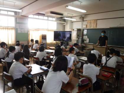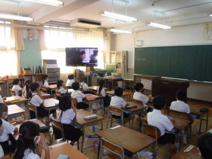 残念ながら、校長室から映すことはできませんでしたが、職員室の放送機器とタブレットで「Teams」を使って各教室に映像と音声で、校長先生のお話を届けました。