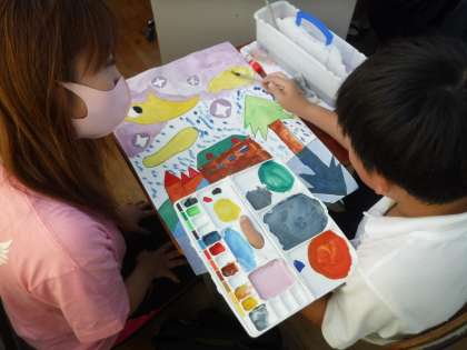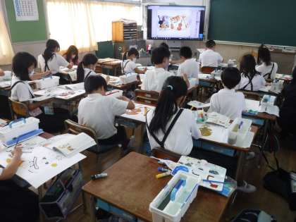 国語科で学習している「こわれた千の楽器」のお話から、自分が思い描く場面を表しています。みんな、とても集中して描いていました。こわれた楽器たちが楽しそうに演奏をしています。