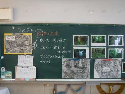 線描の4つの約束を意識して、ジャングルにあるツタの葉や木々を描いていました。集中が途切れることなく描くことができるのは、さすが、6年生ですね。