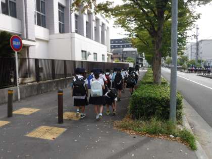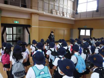講堂で、先生から電車でのマナーなどのお話を聞きました。