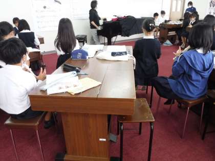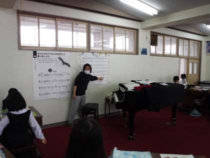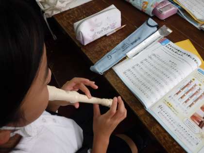 マスク着用での短時間の歌唱練習や、できるだけ同じ方向を向いてのリコーダー演奏、常時換気等の感染症対策を講じながら、学習活動を行っています。