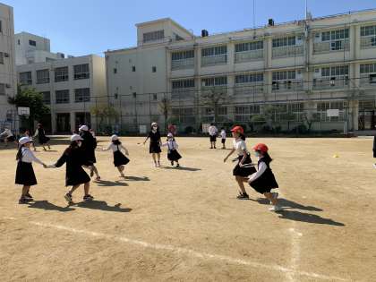 6年生は、手をつなぐ代わりに使うわっかを新聞紙で作ってくれました。それを使って、ペアでおにごっこをしました。