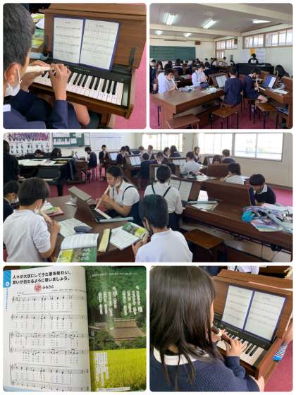 広島への修学旅行に向け、「青い空は」「ふるさと」の演奏を練習しています。今日初めて、上のパートと下のパートを合わせて演奏しました。初めてですが、さすが6年生です。とてもきれいな二重奏でした。