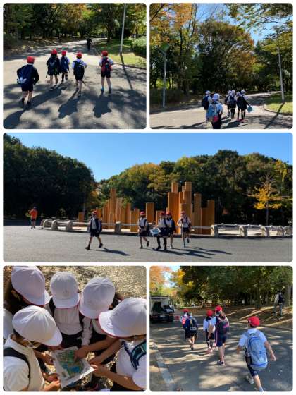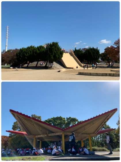 公園内でオリエンテーリングをしたり、大きな滑り台を楽しんだりしています。