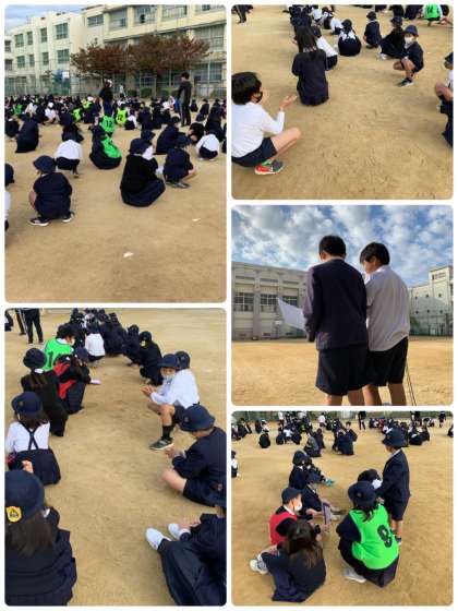 運動場に、たてわり班で集まり、異年齢のペアでクイズに答えました。