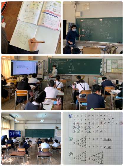 レストランでどんなセットができるか、並べ方と組み合わせ方を考えて調べました。さらに、飲み物を入れたら何通りの組み合わせ方になるか考えました。