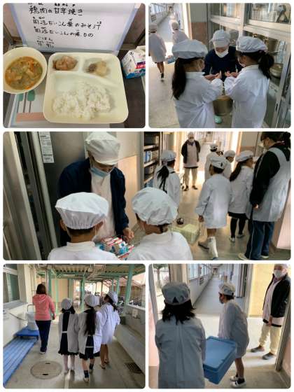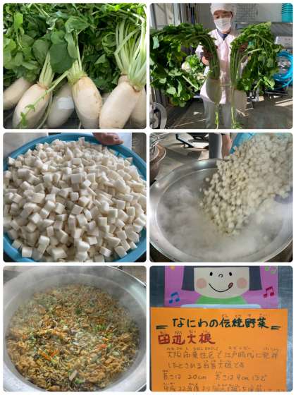 今日の給食には、だいこんが煮物に、だいこん葉がみそ汁の具材に用いられました。
