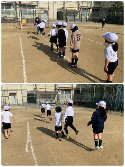 体育科では、大縄跳びを順番にまわし、「大なみ小なみ」や「ゆうびんやさん」をしました。