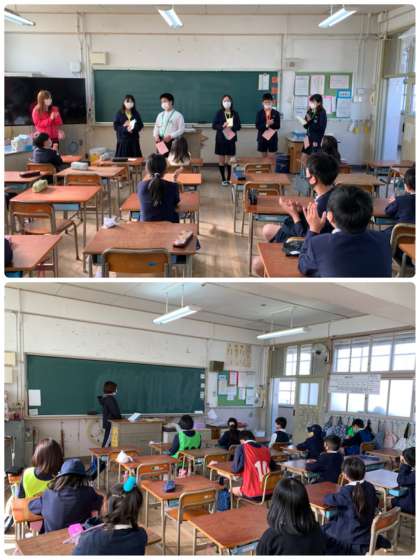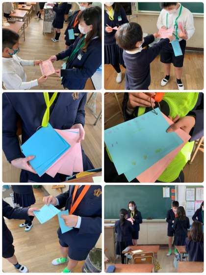 たてわり班の教室で、卒業する6年生と一緒にクイズに答えたり、1年間ありがとうの気持ちを込めてメッセージカードを贈ったり、最後には6年生からみんなへのメッセージを伝えたりしました。