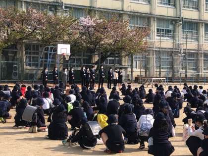 今日は、運動場で始業式を行いました。