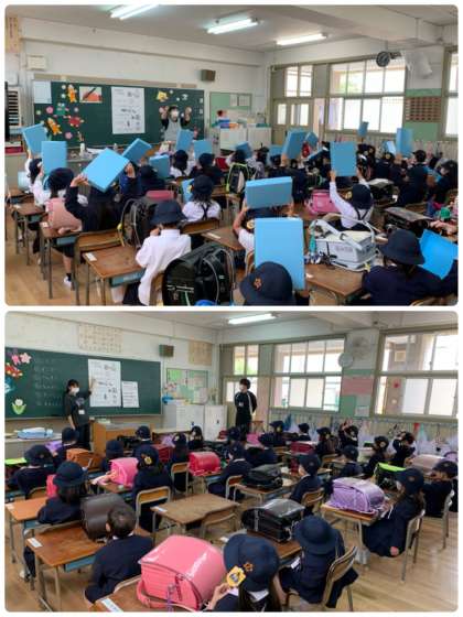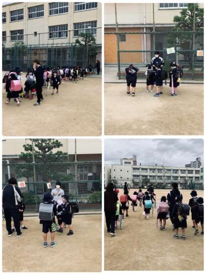 お道具箱の中を先生と一緒に確認して、さようならをします。その後、下校のグループごとに並んで下校しています。