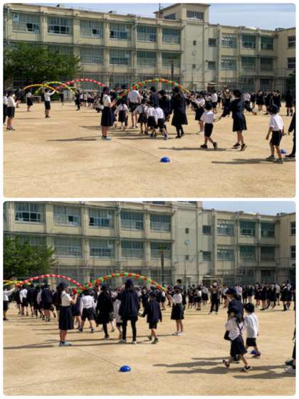 1年生は、6年生とわっかでつないで、アーチをくぐって入場しました。