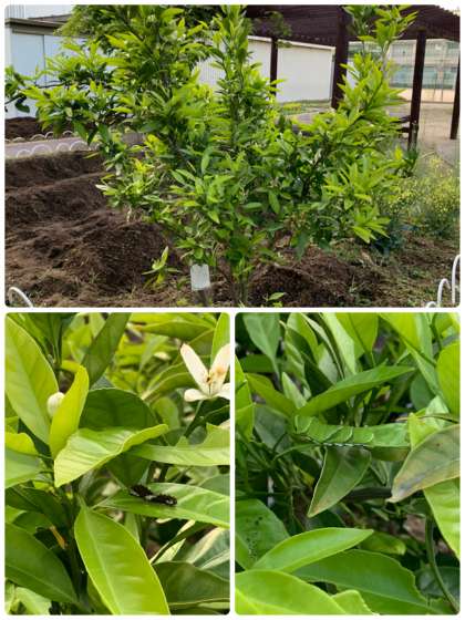 学習園のミカンの木に、アゲハチョウの幼虫がいました。見つけられるかな?