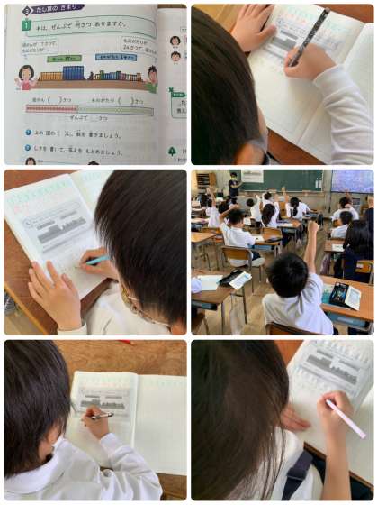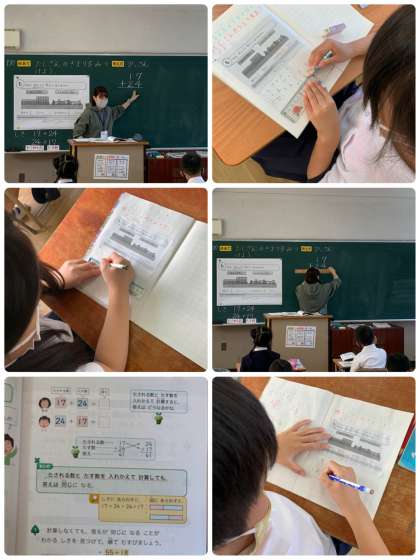 2年生は、算数科「たし算のきまり」で、たされる数とたす数を入れかえて計算しても、答えは同じになることを学習しました。