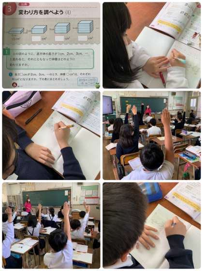 5年生は、算数科「変わり方を調べよう⑴」で、高さが変わるとそれにともなって体積が変わっていくことを学習しました。
